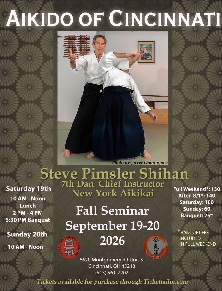 Aikido of Cincinnati is a non-profit organization founded in 1972 and affiliated with the United States Aikido Federation, the largest Aikido association in America headed by Yoshimitsu Yamada Shihan. The head instructor of Aikido of Cincinnati is Charlie McGinnis Sensi, Nanadan (7th degree Black Belt) and Shihan (Master Aikido Instructor). Aikido of Cincinnati has many students and 46 (black belts). Our spacious dojo is located at 6620 Montgomery Road, Unit 3, in Kennedy Heights. There are over 20 classes offered each week at the Aikido of Cincinnati! Each class lasts about an hour and a half. You may attend as many classes as you like. We recommend 2-3 classes per week. New students should attend at least one beginner class per week, but may also attend any of the intermediate classes. See the Class / Schedule link for more information. For additional training opportunities, seminars are provided on a local, national, and international basis throughout the year. Keep a watch on our seminar page for new seminars. Click here to here open our brochure on Aikido of Cincinnati.